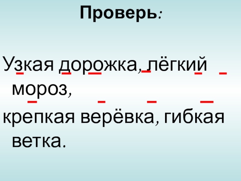 Проверь:Узкая дорожка, лёгкий мороз,крепкая верёвка, гибкая ветка.