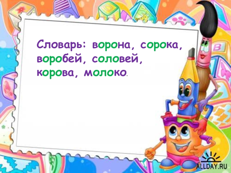 Слайд 14Словарь: ворона, сорока, воробей, соловей, корова, молоко.