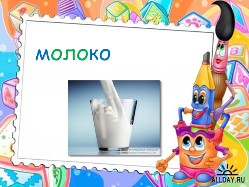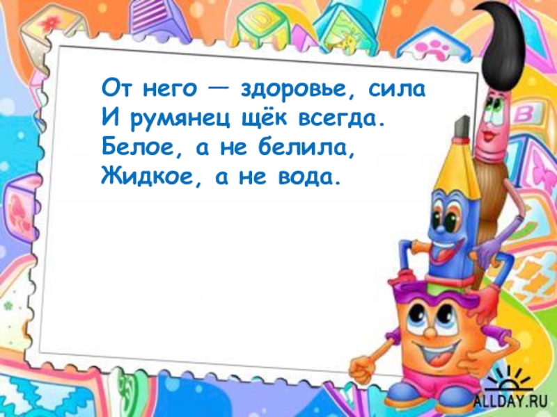 Слайд 12От него — здоровье, сила И румянец щёк всегда. Белое, а не белила, Жидкое,