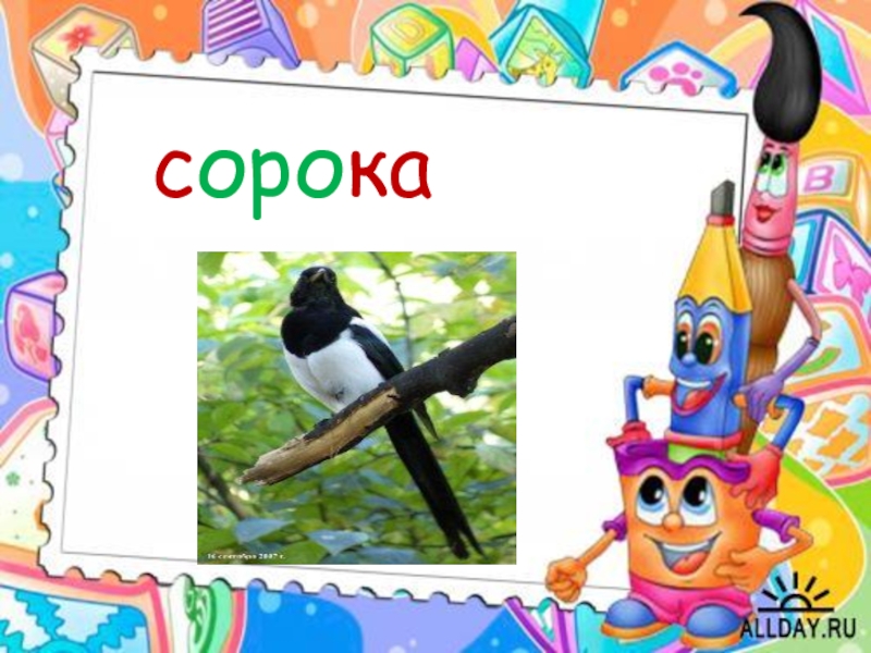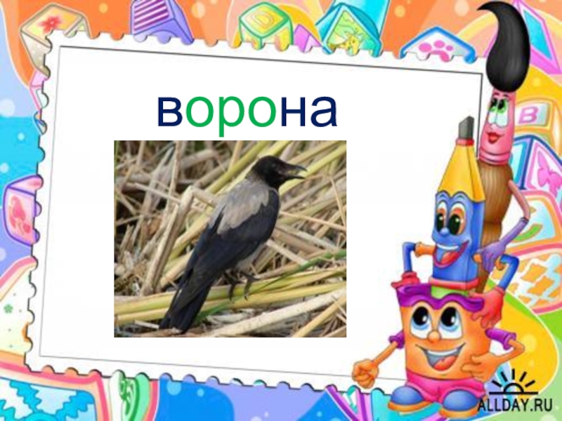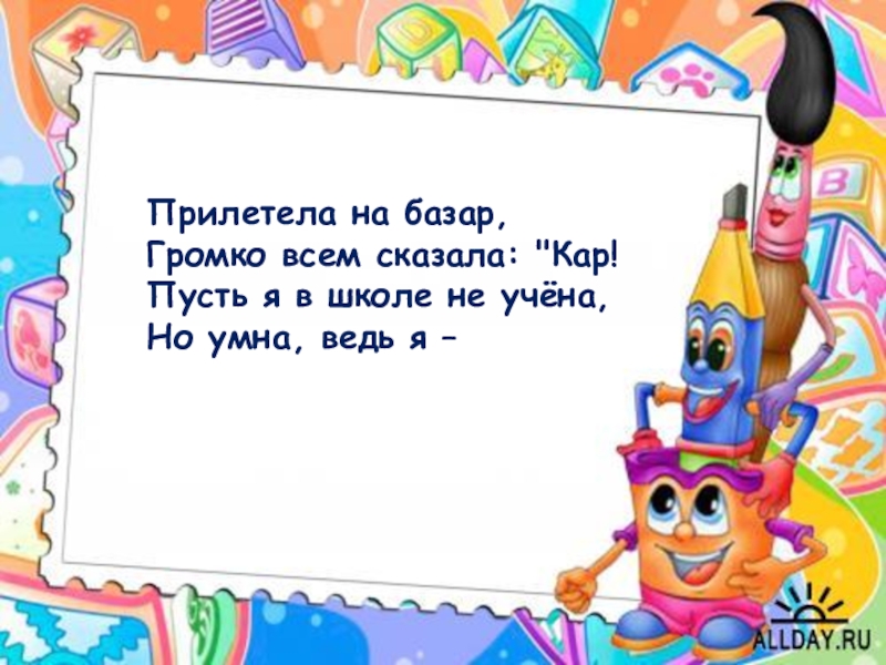 Слайд 2Прилетела на базар, Громко всем сказала: "Кар! Пусть я в школе не учёна, Но