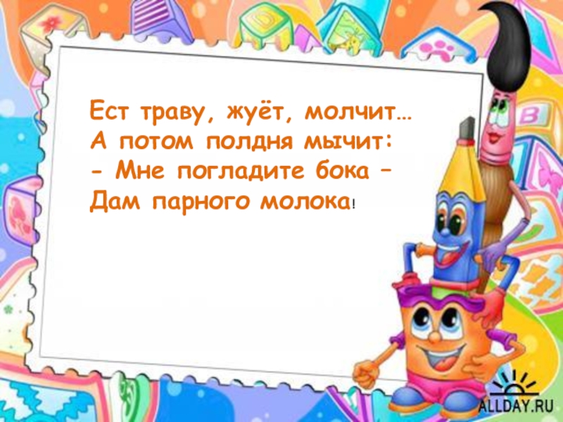 Слайд 10Ест траву, жуёт, молчит… А потом полдня мычит: - Мне погладите бока – Дам
