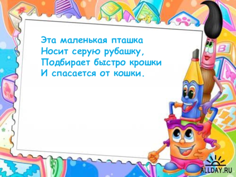 Слайд 6Эта маленькая пташка Носит серую рубашку, Подбирает быстро крошки И спасается от кошки.