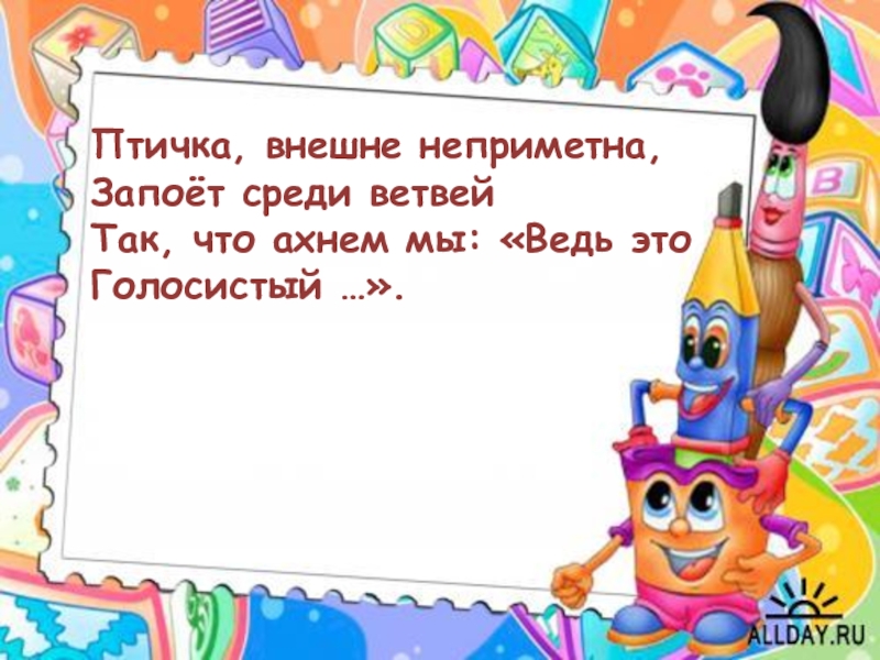 Птичка, внешне неприметна, Запоёт среди ветвей Так, что ахнем мы: «Ведь это Голосистый …».