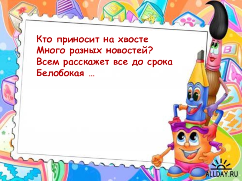Слайд 4Кто приносит на хвосте  Много разных новостей? Всем расскажет все до срока Белобокая …