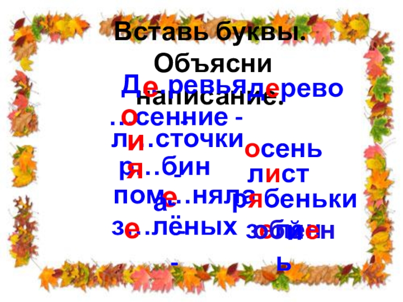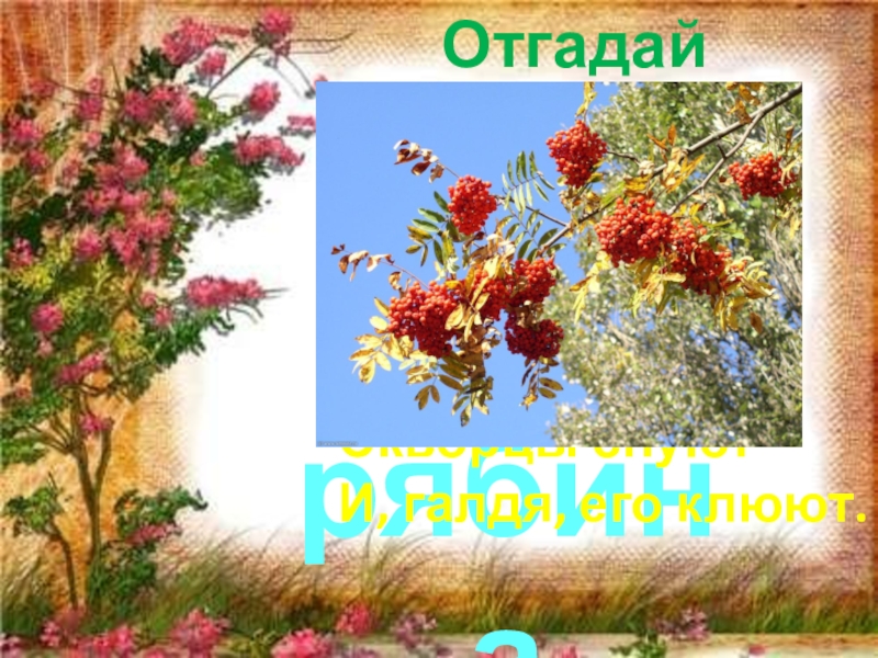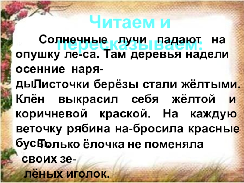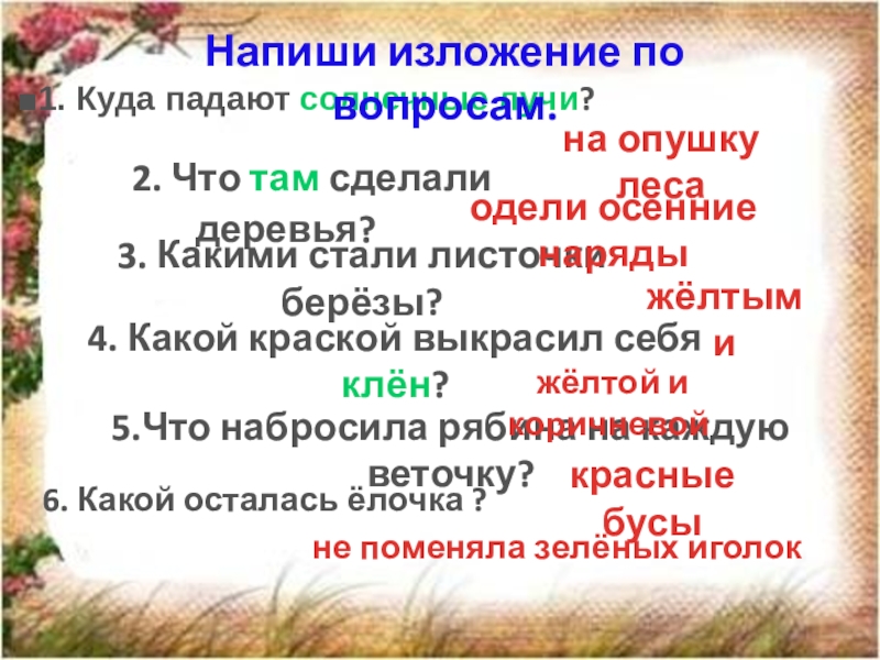 Листочки берёзы стали жёлтыми. Клён выкрасил себя жёлтой и коричневой краской. На каждую веточку рябина на-бросила красные бусы.