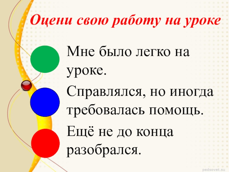 Оцени свою работу на урокеМне было легко на уроке.Справлялся, но иногда требовалась помощь.Ещё не до конца разобрался.