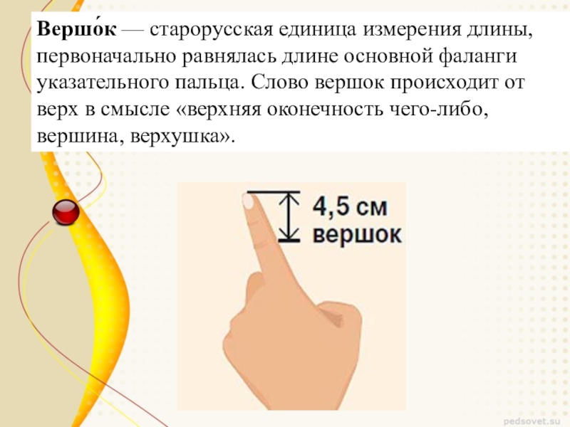 Слайд 13Вершо́к — старорусская единица измерения длины, первоначально равнялась длине основной фаланги