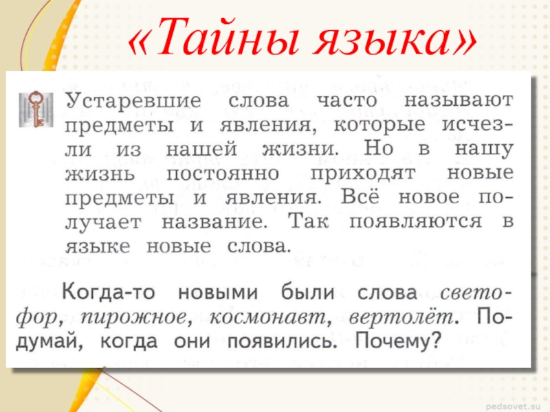 Презентация, доклад по русскому языку на тему Устаревшие слова, слова-синонимы, новые слова (2 класс)