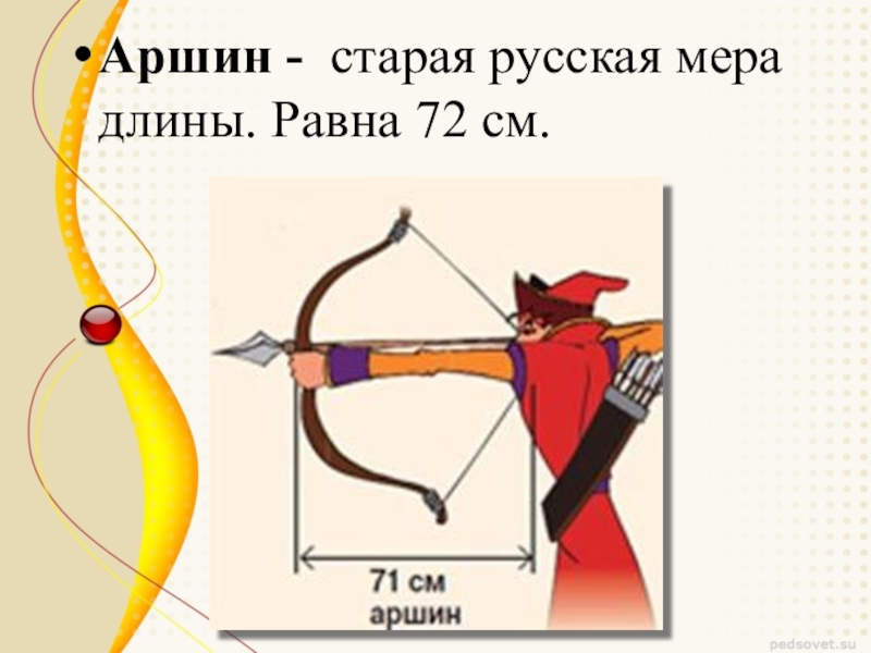 Слайд 14Аршин -  старая русская мера длины. Равна 72 см.