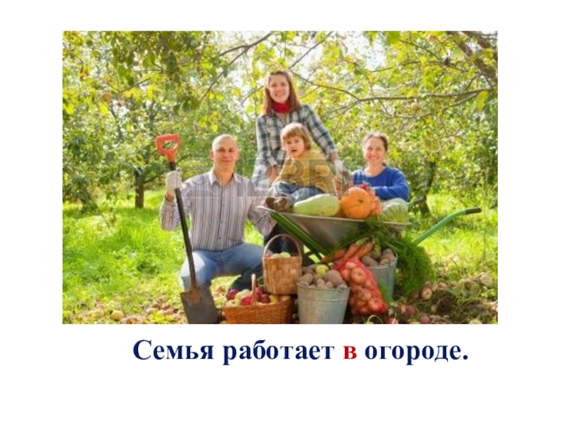 Слайд 4Семья работает в огороде.