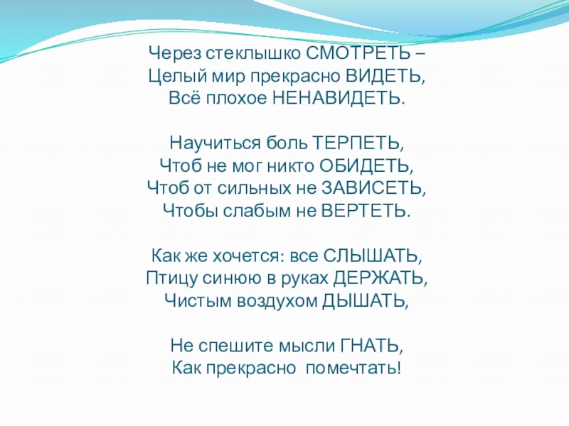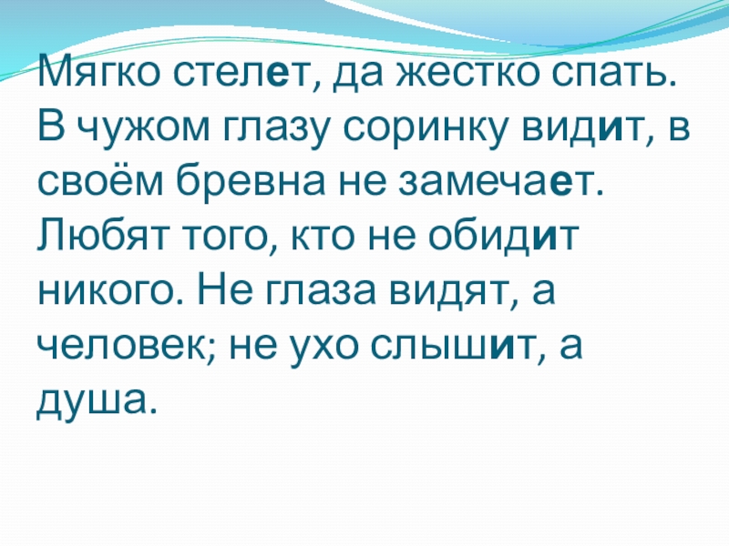 Мягко стел_т, да жестко спать. В чужом глазу соринку вид_т, в своём бревна не замеча_т. Любят того, кто не обид_т никого. Не глаза видят, а человек; не ухо слыш_т, а душа.