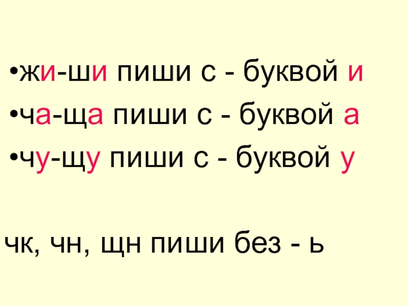 жи-ши пиши с - буквой ича-ща пиши с - буквой ачу-щу пиши с - буквой у чк, чн, щн пиши без - ь