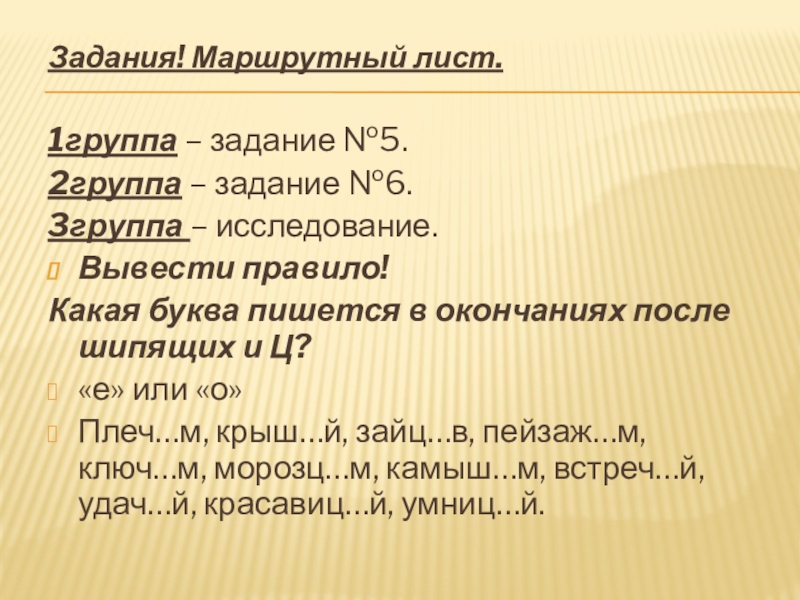 Плеч…м, крыш…й, зайц…в, пейзаж…м, ключ…м, морозц…м, камыш…м, встреч…й, удач…й, красавиц…й, умниц…й.