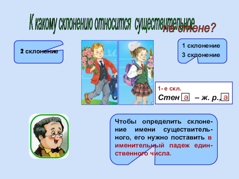 Чтобы определить склоне-ние имени существитель-ного, его нужно поставить в именительный падеж един-ственного числа.
