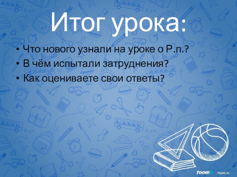 Итог урока:Что нового узнали на уроке о Р.п.?В чём испытали затруднения?Как оцениваете свои ответы?