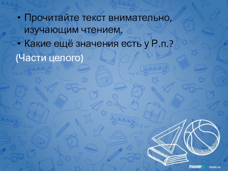 Прочитайте текст внимательно, изучающим чтением.Какие ещё значения есть у Р.п.?(Части целого)