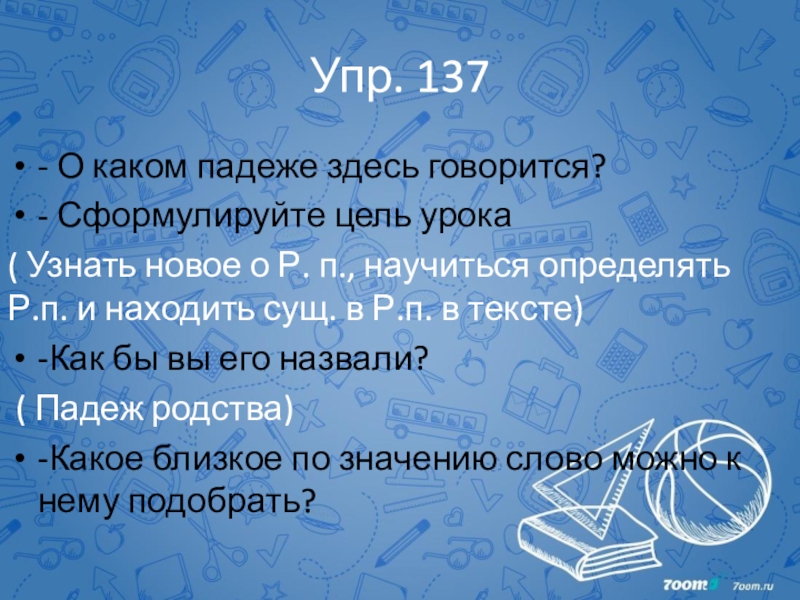 Упр. 137- О каком падеже здесь говорится?- Сформулируйте цель урока ( Узнать новое о Р. п., научиться