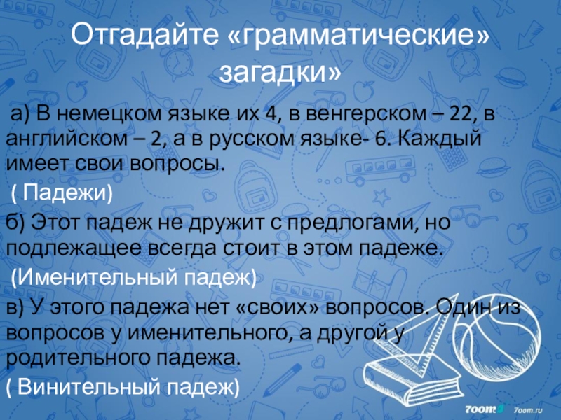 Отгадайте «грамматические» загадки» а) В немецком языке их 4, в венгерском – 22, в английском – 2, а в русском языке- 6. Каждый имеет свои вопросы. ( Падежи)б) Этот падеж не дружит с предлогами, но подлежащее