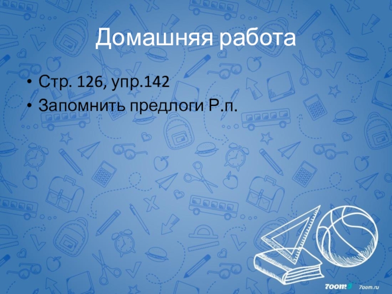 Домашняя работаСтр. 126, упр.142Запомнить предлоги Р.п.