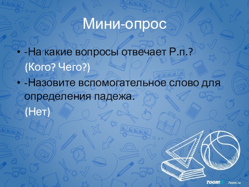 Мини-опрос-На какие вопросы отвечает Р.п.?  (Кого? Чего?)-Назовите вспомогательное слово для определения падежа.  (Нет)