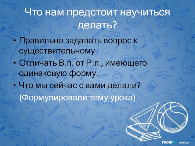 Что нам предстоит научиться делать?Правильно задавать вопрос к существительномуОтличать В.п. от Р.п., имеющего одинаковую форму.Что мы сейчас