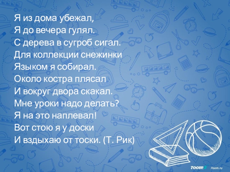 Я из дома убежал,Я до вечера гулял.С дерева в сугроб сигал.Для коллекции снежинкиЯзыком я собирал.Около костра плясалИ