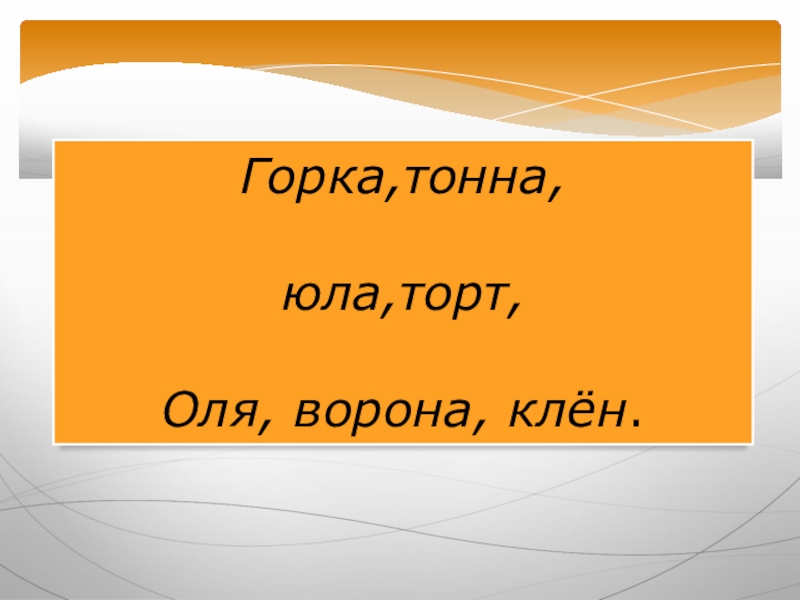Горка,тонна, юла,торт,Оля, ворона, клён.