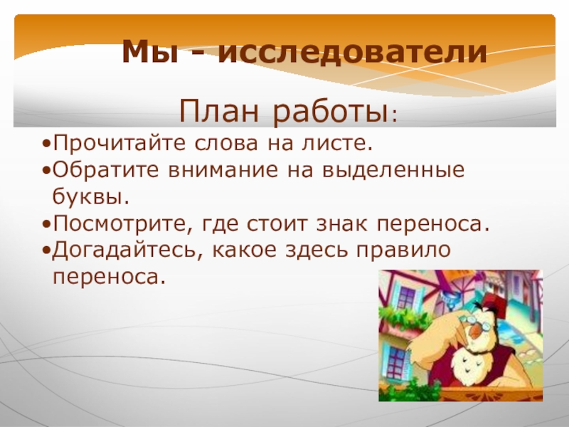 Мы - исследователиПлан работы:Прочитайте слова на листе.Обратите внимание на выделенные буквы.Посмотрите, где стоит знак переноса.Догадайтесь, какое здесь