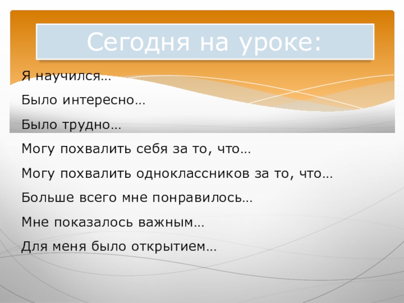 Сегодня на уроке:Я научился…Было интересно…Было трудно…Могу похвалить себя за то, что…Могу похвалить одноклассников за то, что…Больше всего