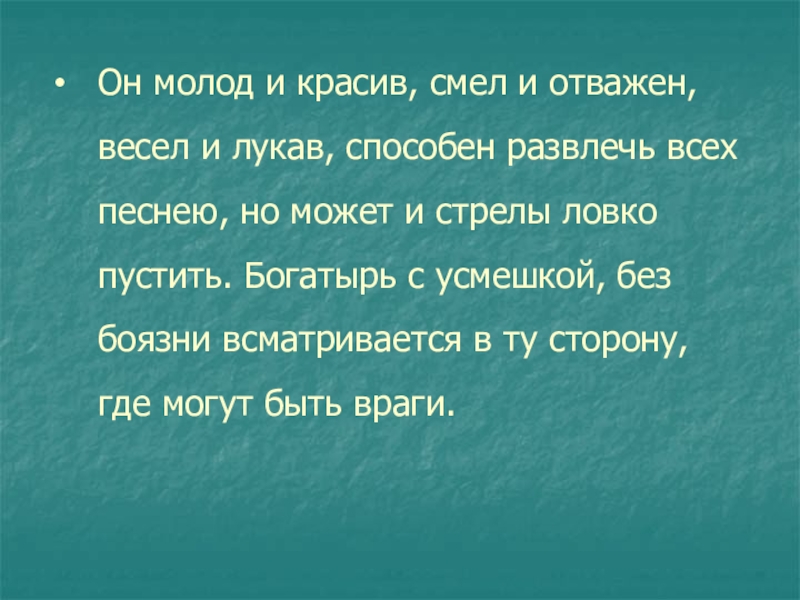 Слайд 9Он молод и красив, смел и отважен, весел и лукав, способен