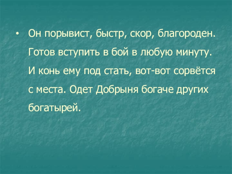 Слайд 7Он порывист, быстр, скор, благороден. Готов вступить в бой в любую минуту.