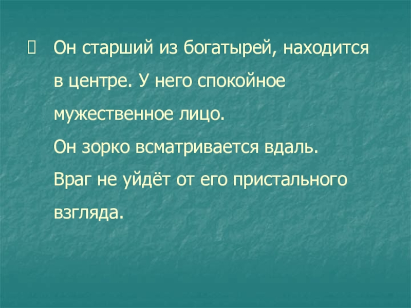 Слайд 5Он старший из богатырей, находится в центре. У него спокойное мужественное