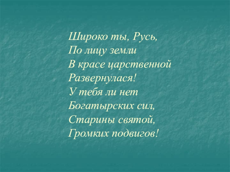 Широко ты, Русь, По лицу земли В красе царственной Развернулася! У тебя ли нет Богатырских сил, Старины святой, Громких подвигов!