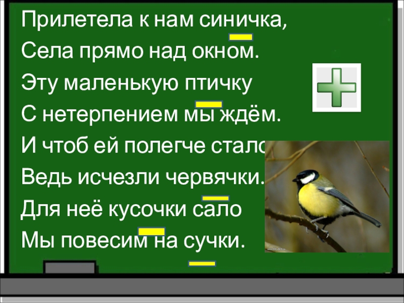 Прилетела к нам синичка,Села прямо над окном.Эту маленькую птичкуС нетерпением мы ждём.И чтоб ей полегче стало,Ведь исчезли