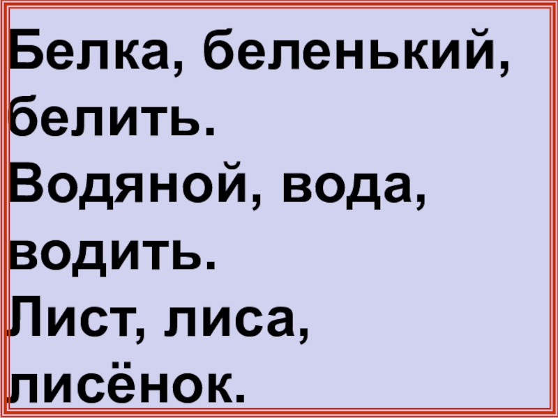 Слайд 6Белка, беленький, белить. Водяной, вода, водить. Лист, лиса, лисёнок.