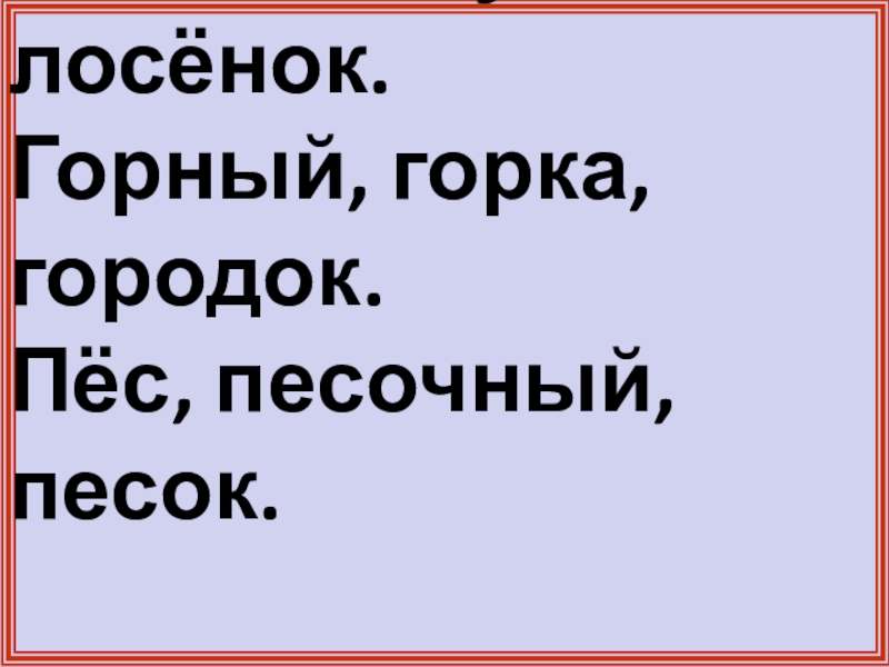 Лось, лоскут, лосёнок. Горный, горка, городок. Пёс, песочный, песок.