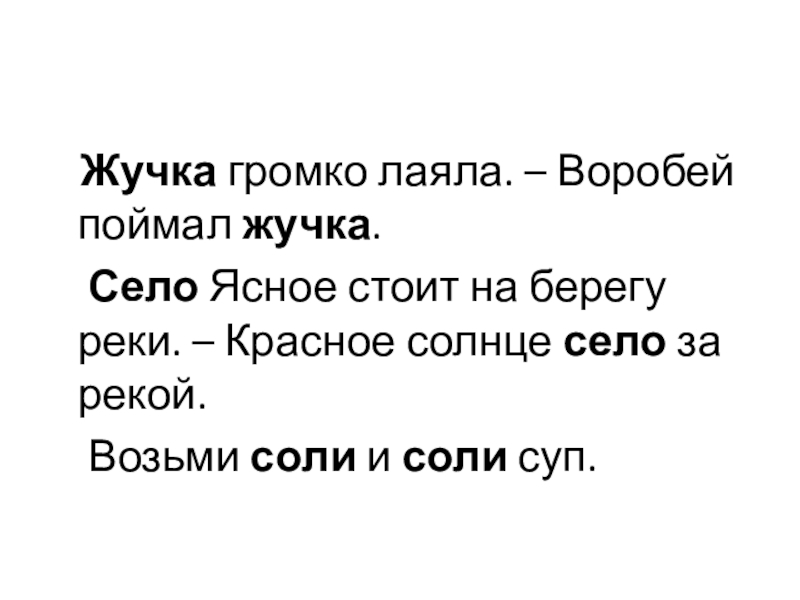Жучка громко лаяла. – Воробей поймал жучка.   Село Ясное стоит на берегу реки. –