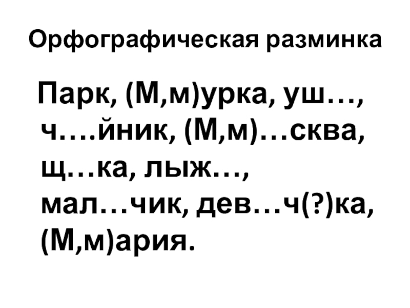 Орфографическая разминка Парк, (М,м)урка, уш…, ч….йник, (М,м)…сква, щ…ка, лыж…, мал…чик, дев…ч(?)ка, (М,м)ария.