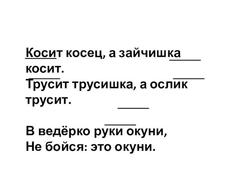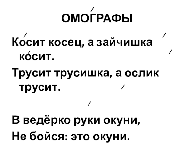 ОМОГРАФЫКосит косец, а зайчишка косит.Трусит трусишка, а ослик трусит.В ведёрко руки окуни,Не бойся: это окуни.