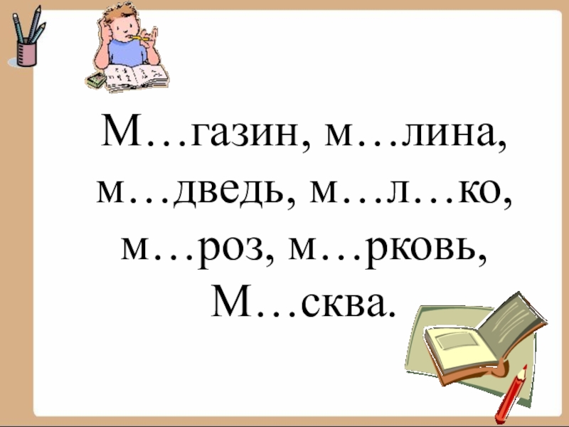 Слайд 2М…газин, м…лина, м…дведь, м…л…ко, м…роз, м…рковь, М…сква.