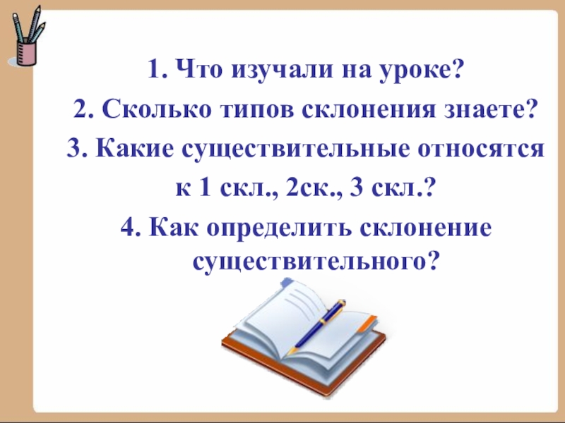 1. Что изучали на уроке? 2. Сколько типов склонения знаете? 3. Какие существительные относятся к 1 скл.,