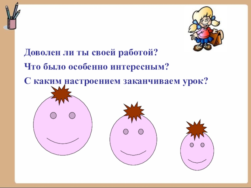Доволен ли ты своей работой?Что было особенно интересным?С каким настроением заканчиваем урок?