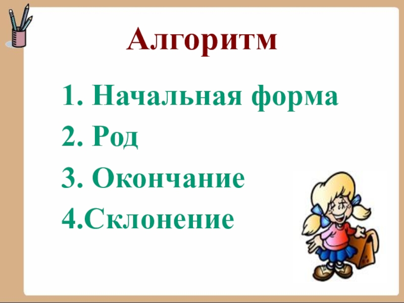 Алгоритм1. Начальная форма2. Род3. Окончание4.Склонение