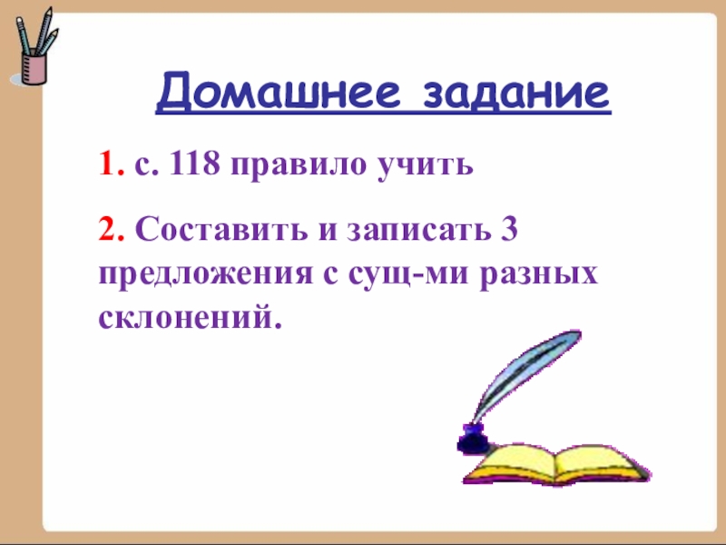 Домашнее задание 1. с. 118 правило учить2. Составить и записать 3 предложения с сущ-ми разных склонений.