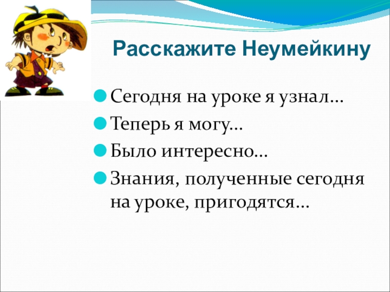 Расскажите НеумейкинуСегодня на уроке я узнал…Теперь я могу…Было интересно…Знания, полученные сегодня на уроке, пригодятся…