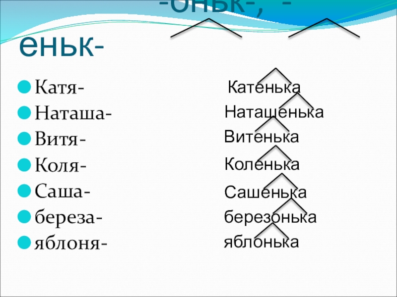 -оньк-, -еньк-Катя-Наташа-Витя-Коля-Саша-береза-яблоня-КатенькаНаташенькаВитенькаКоленькаСашенькаберезонькаяблонька