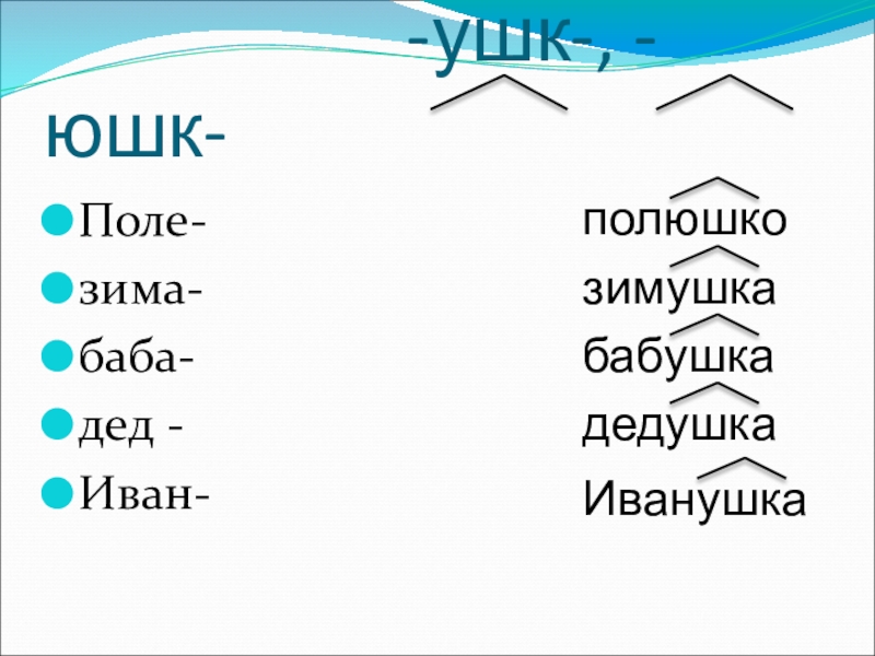-ушк-, -юшк-Поле-зима-баба-дед -Иван-полюшкозимушкабабушкадедушкаИванушка