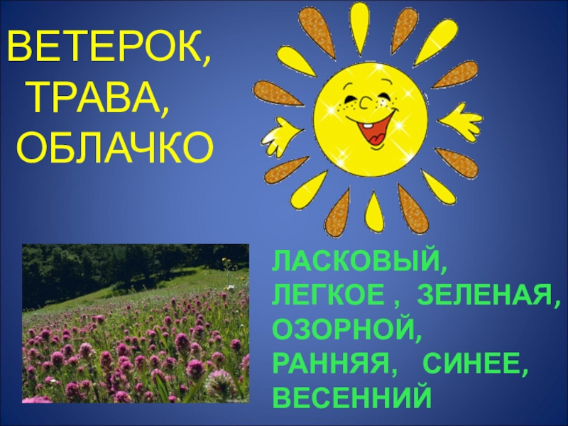 ВЕТЕРОК,  ТРАВА, ОБЛАЧКОЛАСКОВЫЙ,ЛЕГКОЕ , ЗЕЛЕНАЯ,ОЗОРНОЙ,РАННЯЯ,  СИНЕЕ,ВЕСЕННИЙ