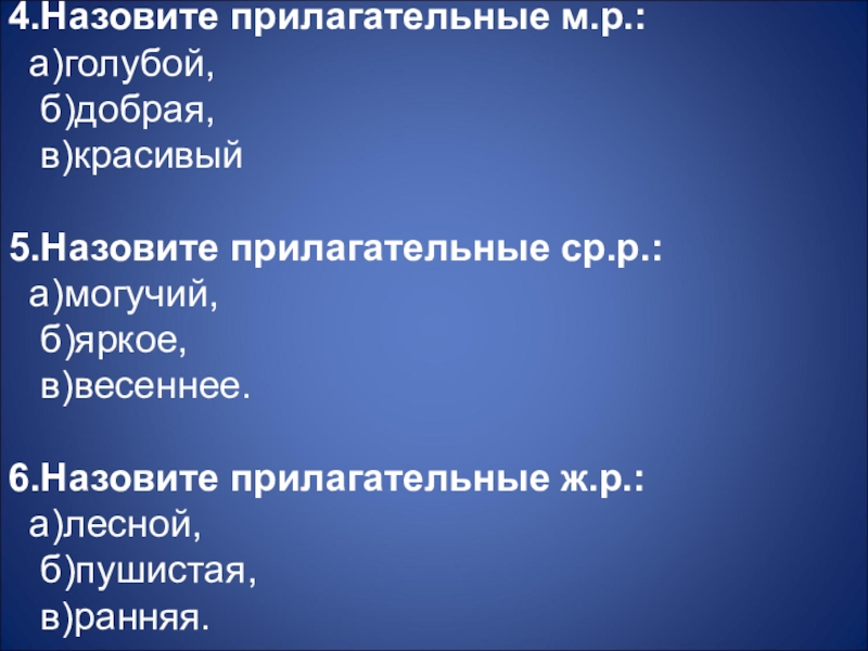 4.Назовите прилагательные м.р.: а)голубой,  б)добрая,  в)красивый5.Назовите прилагательные ср.р.: а)могучий,  б)яркое,  в)весеннее.6.Назовите прилагательные ж.р.: