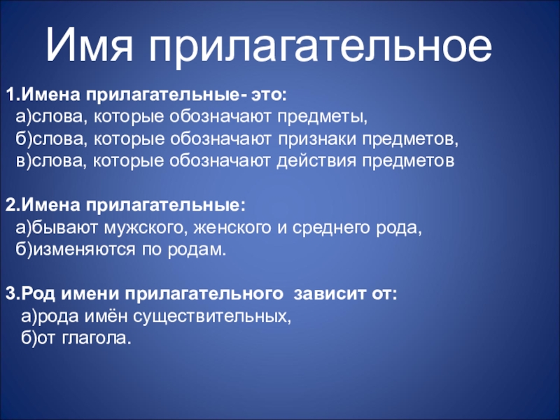 Имя прилагательное1.Имена прилагательные- это: а)слова, которые обозначают предметы,  б)слова, которые обозначают признаки предметов, в)слова, которые